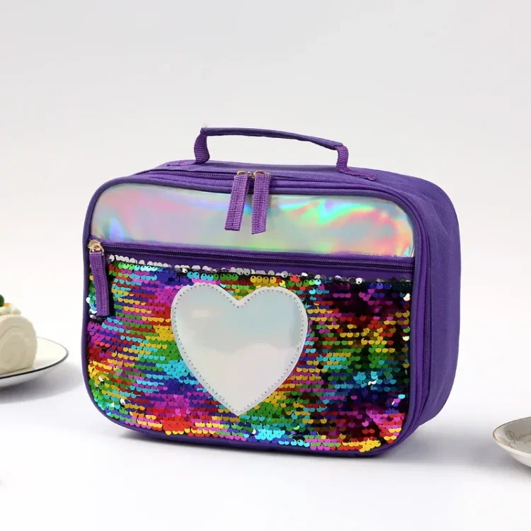 High Quality Fashion Waterproof Reverse Sequin Insulated Kids Girls Boy Lunch Box Glitter Tote Bag Cooler Picnic Pouch for Food